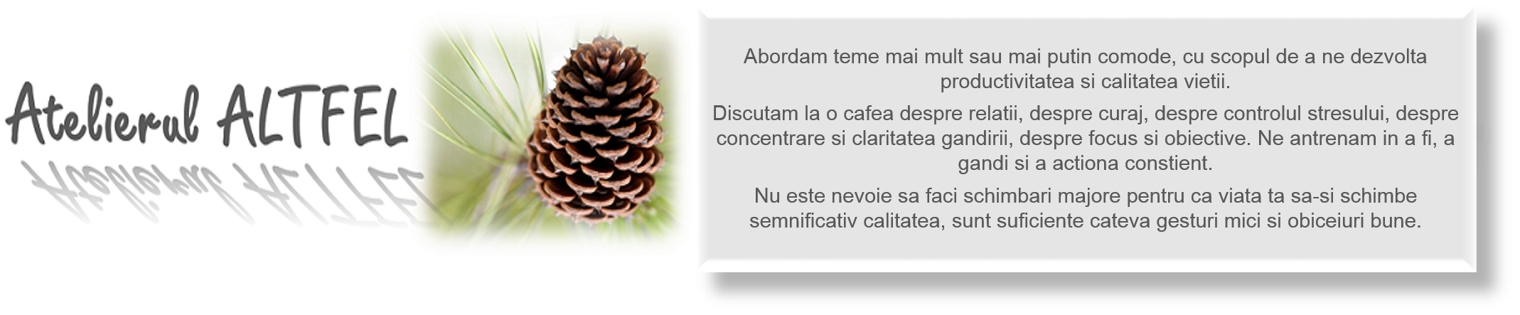Ce este? Proiectul 'Atelierul ALTFEL' este defapt o serie de ateliere, la care te asteptam sa abordam impreuna teme neconventionale, unele incomode, dar care ne preocupa in fiecare zi si in general, ne cam fac viata grea. Practicam impreuna pentru a ne creste productivitatea, controlul asupra actiunilor noastre si bucuria de a trai. |